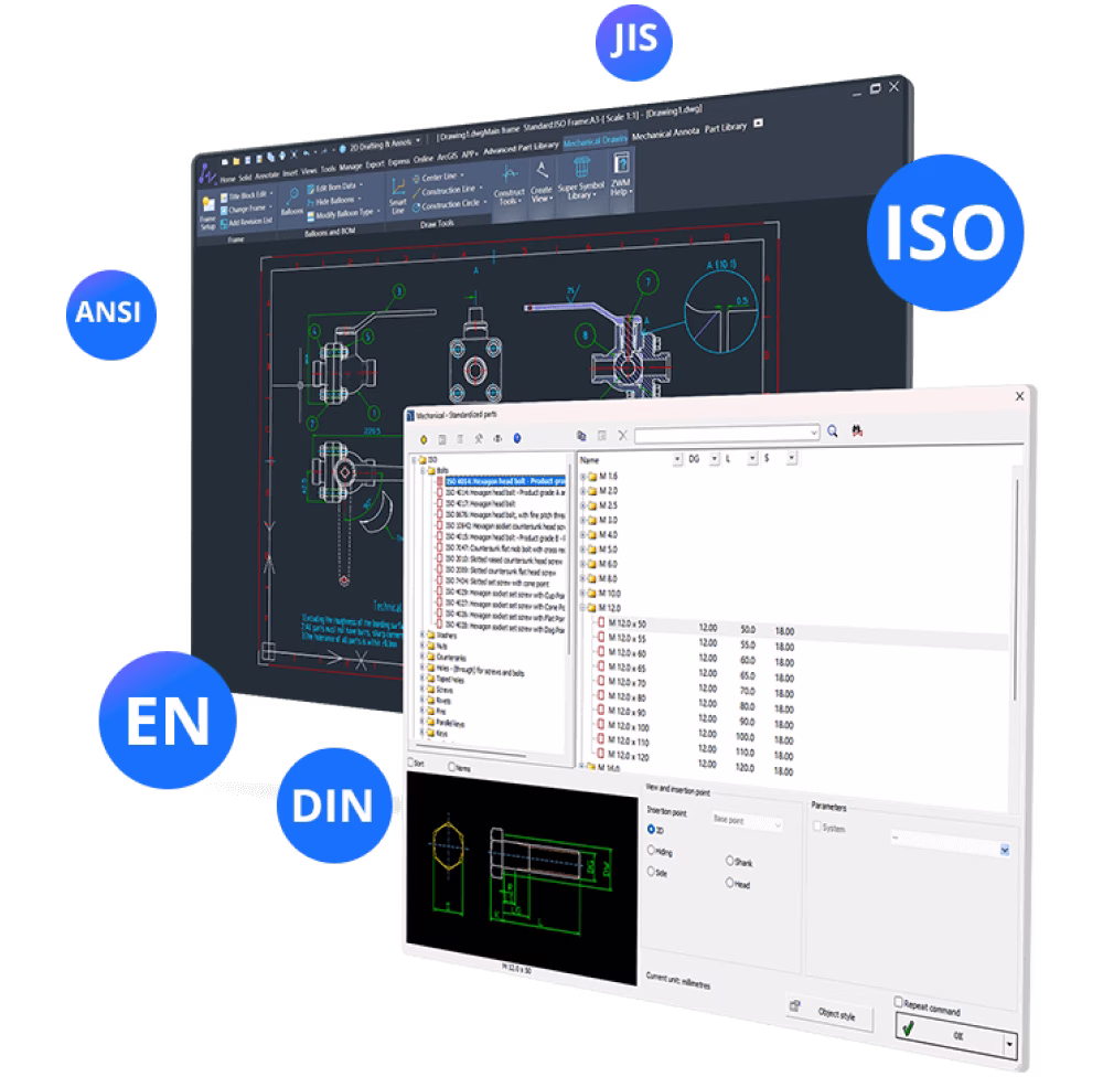 Met ZWCAD MFG maakt u snel tekeningen die voldoen aan nationale en internationale normen (ISO, EN, DIN, ANSI, ASME, PN, IS, JIS en meer). Van bouten en schroeven tot klinknagels en studs: vind eenvoudig de juiste onderdelen voor elk CAD-project.